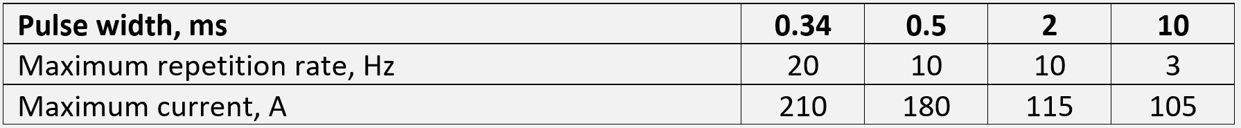 ** Calculated for standard operation mode: pulse duration 0.5 ms, repetition rate 10 Hz, current 180 A
