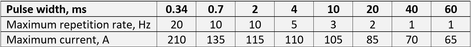 ** Calculated for standard operation mode: pulse duration 0.34 ms, repetition rate 20 Hz, current 210 A