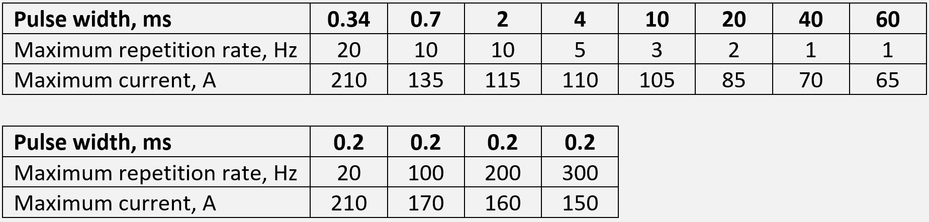 ** Calculated for standard operation mode: pulse duration 0.34 ms, repetition rate 20 Hz, current 210 A