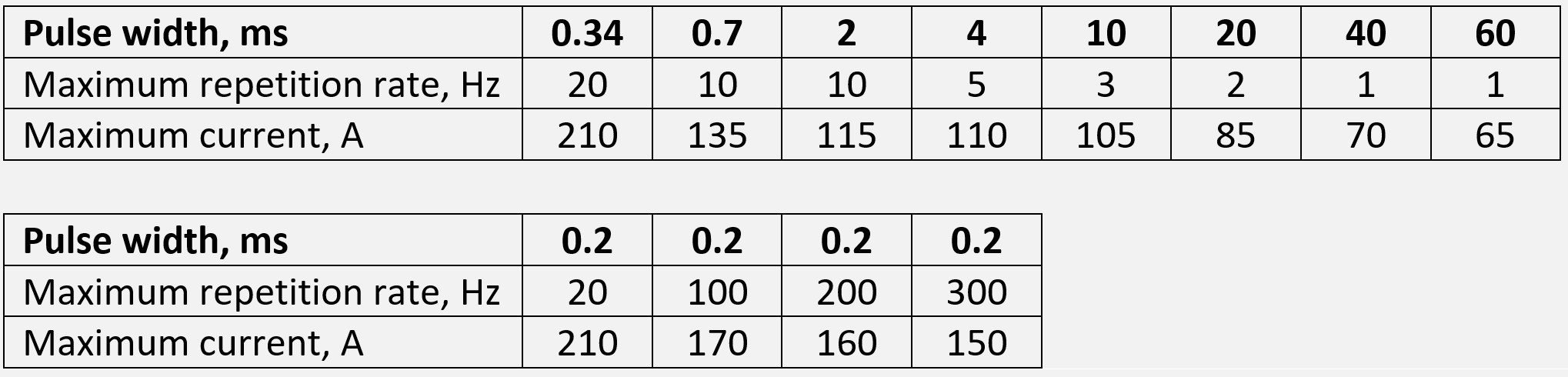 ** Calculated for standard operation mode: pulse duration 0.34 ms, repetition rate 20 Hz, current 210 A