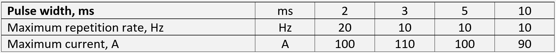 * Calculated for standard operation mode: pulse duration 10 ms, repetition rate 10 Hz, current 110 A.
